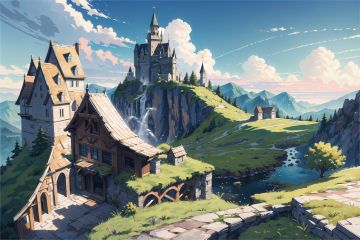 ((best quality)),High saturation,clear,rational construction,cartoon style,architecture, bridge, building,castle, chimney,  ((best quality)),High saturation,clear,rational construction,cartoon style,architecture, bridge, building,castle, chimney, cloud, cloudy_sky, day,  fantasy, gate, grass, house, mountain, no_humans, outdoors, river, scenery, sky, sunset, thick,impasto,look down,color lump,look far into the distance,build group,mountainous region,abundant,mountain,epic,perspective,grandiose,comfortable, reasonable structure,shock,high detail,abundant,8k,green,tree,Reasonable light and dark relationship,concept art,high detail,distinct,game,vivid,level design,