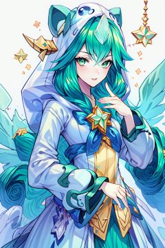 (best quality,masterpiece:1.1,ultra detailed,extremely detailed CG unity 8k wallpaper,masterpiece,RAW photo),(realistic,photo-realistic:1.1,1girl,solo),((perfect female body,narrow waist)),1girl, solo, single horns, (single horn), long hair, green eyes, star guardian (league of legends), animal ears,(green hair), long sleeves, gradient background, bangs, looking at viewer, shoes, hood, alternate costume, puffy sleeves, alternate hair color, star (symbol),upper body, real photo,nijistyle, , ,fairy tale girl, <lora:EMS-11050-EMS:1>, <lora:EMS-7147-EMS:0.8>