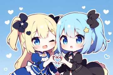 2girl,  ( star hair ornament) girl,blue hair, short hair, blue eyes, chibi,heart hands duo, wince, one eye closed,  prt,blonde hair, blue eyes, one side up,( long hair) girl, chibi,