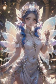 fairy, butterfly_wings,gem,cowboy shot,vibrant colors,stunning environment ,soft lighting,gorgeous light and shadow,white_dress,stylish pose,(Shirtwaist Dress),hand up