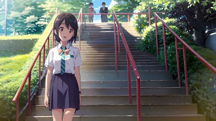masterpiece,best quality,1girl, miyamizu mitsuha, 1boy, shirt, green necktie, outdoors, necktie, skirt, tree, white shirt, bowtie, building, sky, bow, black hair, cloud, railing, day, school uniform, short sleeves, hair ribbon, red bow, ribbon, scenery, looking at another, city, striped, pants, collared shirt, red bowtie, pleated skirt, brown eyes, cityscape, striped necktie, short hair, open mouth, blue sky, black skirt, stairs, green bow, socks, skyscraper, cloudy sky, sunlight, dappled sunlight, kneehighs, striped bow, red ribbon, smile, black pants, standing, green bowtie, road, bangs, short ponytail, bag