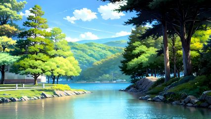 masterpiece,best quality,scenery, no humans, outdoors, tree, landscape, sky, day, nature, mountain, water, river, forest, lake, building, sunlight, cloud, house, watercraft, road