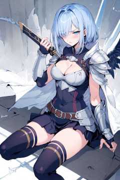 (masterpiece:1.2), best quality,PIXIV, 1girl, solo, armor, hair over one eye, sitting, blue eyes, cape, breasts, weapon, sword, thighhighs, skirt, boots, shoulder armor, gauntlets, medium breasts, bodysuit, short hair, simple background, pauldrons, head wings, planted, planted sword, grey hair, armored boots, sidelocks, cleavage, greaves, black skirt <lora:line style_20230720122106:0.8>