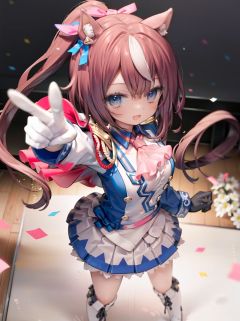 masterpiece, best quality, tokai teio \(umamusume\), from above, brown hair,pointing up, looking up, smile, open mouth, confetti, hair ribbon, pink ribbon, single epaulette, pink ascot, red capelet, long sleeves, asymmetrical gloves, mismatched gloves, white glove, blue glove, multicolored clothes, two-tone jacket, white jacket, blue jacket, shirt, buttons, double-breasted, white skirt, pleated skirt, two-tone skirt, miniskirt, white footwear, knee boots,  <lyco:帝王tokai_teio_loha-000010:0.7>