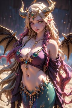 (((elf,purple and gold star slime girl))),((((multicolored_hair,blond and purple hair,long hair,slime hair)))),(((heterochromia,purple and yellow eyes))),(jewel_like eyes),detailed eyes, detailed face ,g_cup size breast,(((holy halo,four wings,star wings))),((purple and gold slime tentacle))),(((big horns,gold horns, purple horns,four horns))),(((a lot of jewel,galactic tiara,star shaped necklace))),((gold and purple bikini)),(((dragon mermaid tail))),((beach,noon)),