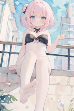 (Masterpiece, best quality:1.2),(ultra-detailed),(pastel color:1.5),(cute illustration:1.5),(watercolor:1.2),shiny skin,1girl,large pectorals, Updo,Pink hair,Strapless Top,white pantyhose,legs,no shoes, presenting foot,(foot focus:1.3),city,in summer,sunny,from below,<lora:xuegao:0.4>