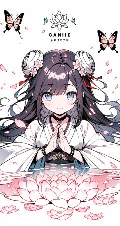 (watercolor:1.3),(ink:1.7),bloom effect,(best quality),(world masterpiece),(illustration),(black hair), Gorgeous Hanfu, (wide sleeves: 1.5), (cute face), delicate muscle lines, beautiful hands, (1girl:1.2), (bun, fringe, hairpin), ( extremely detailed eyes and face), long hair, detailed,(detailed beautiful lotus pond with petal:1.1),flower,butterfly,necklace,smile,petal,(silver bracelet), (surrounded by heavy floating petal flow:1.3)