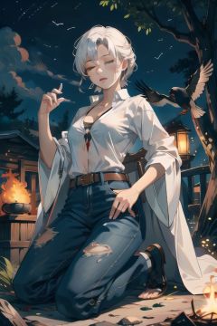(masterpiece, best quality:1.2,more than 5 fingers), ciriW3_soul3142, 1girl, breasts, shirt, medium breasts, closed eyes, weapon, white hair, outdoors, belt, pants, tree, kneeling, meditating, bird, animal, scar, brown pants, crow, fire, embers, night