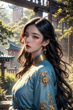 best quality, masterpiece, (photorealistic:1.4), <lora:tpqy:1>1girl,realistic,tpqy,dramatic lighting, from below,Light blue clothes,golden flowers on the clothes