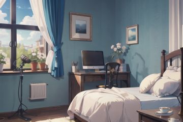 Bare thigh,extremely detailed CG unity 8k wallpaper,illustration,lens 135mm,masterpiece,best quality,no humans,flower,virtual youtuber,indoors,bed,pillow,window,stuffed toy,girl’s bedroom,table,cat,stuffed animal,bell,chair,curtains,cloud,microphone,rose,day,white flower,neck bell,english text,sky,plant,scenery,blue tone,no human<lora:room:1>.,