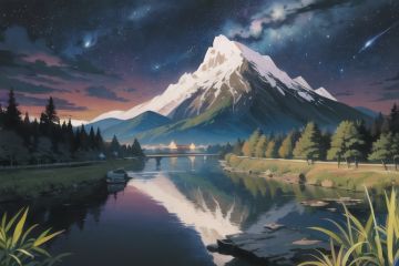 detailed background,high quality,official art,artwork,absurdres,highres,painting \(medium\),landscape,nature,digital painting,panorama,detailed,sky,night sky,star \(sky\),milky way,bamboo forest,fantastical,river,peak,bamboo house,