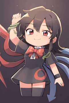 masterpiece, best quality,   <lora:NueHoujyuu:1>,houjuu nue, black hair,short hair,red eyes,red bow,short sleeves,wristband,snake,,black dress,black thighhighs,asymmetrical wings,smile <lora:style05:1>,(chibi:1.2),white background,