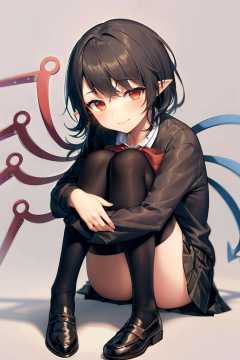 masterpiece, best quality, <lora:NueHoujyuu:1>,1girl, solo, houjuu nue, black hair, thighhighs, wings, red eyes, skirt, smile, asymmetrical wings, pointy ears, black thighhighs, sitting, shoes, alternate costume, looking at viewer, hugging own legs, long sleeves, blush, school uniform, short hair, sketch, bow, shirt, vest, zettai ryouiki, loafers, full body, miniskirt, contemporary, bowtie, pleated skirt