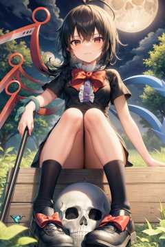 masterpiece, best quality, <lora:NueHoujyuu:1>,1girl, solo, houjuu nue, skull, red eyes, wings, snake, asymmetrical wings, black hair, weapon, short hair, sitting, bug, trident, polearm, tree, butterfly, bare legs, bare tree, convenient censoring, legs, dress, cloud, sky, bow, moon, shoes, no panties, ahoge, short sleeves, no socks, bottomless, looking at viewer