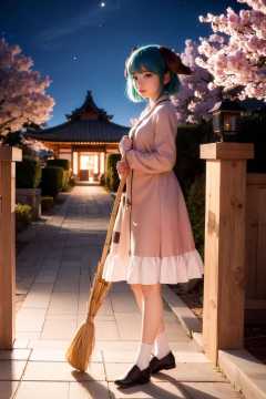 masterpiece, best quality, <lora:KasodaniKyouko:1>,1girl, kasodani kyouko, solo, green hair, green eyes, broom, animal ears, petals, dress, cherry blossoms, stone lantern, short hair, night, bamboo broom, sky, architecture, lantern, east asian architecture, standing, long sleeves, looking at viewer, smile, night sky, pink dress, shoes, tree, holding, socks, outdoors, star (sky), white socks, holding broom, dog ears, starry sky, building, pavement, scenery, brown dress