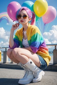 masterpiece, best quality,1 girl, pretty and cute, (rainbow color Highlight Hair,colorful hair:1.4), wearing blue and purple sunglasses, yellow jacket with white pattern, white sweater, many colored balloons, doll face, ponytail braid, perfect detail eyes, delicate face, perfect cg, HD quality, colored balloons, sky ,colorful boots,full_body