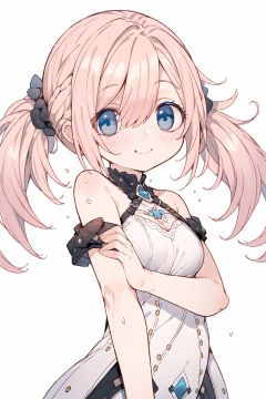 blue eyes,light smile,(white rough outline:1.2),(detailed beautiful eyes:1.3),(looking at viewer:1.2),(rough outline:1.2),Bare shoulders,long hair,twintails,yellow hair,big breasts,smile,pink hair,hair over one eye,hair tie,medium hair with long locks,low tied,low ponytail,flat chest,bare shoulders,blush,light smile,closed mouth,