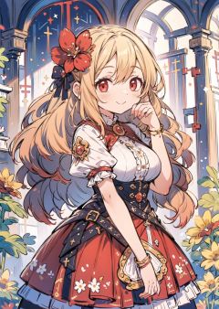 (masterpiece, best quality, high quality, highres, ultra-detailed),Smile,shy,indoors,large breasts,fantasy clothes,frills,flower,blond hair,long hair,red eyes,