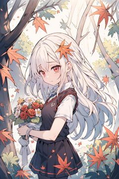 (portrait),(from_side),(looking_away),(turning_head),upper_body,1girl,solo,loli,petite,white_hair,(very_long_hair),red_eyes,medium_breasts,(closed_mouth),(emotionless),straight_hair,white_shirt,(sweater_vest),(black_pleated_skirt),(white_pantyhose),wind_lift,hair_lift,maple_leaves,maple_tree,falling_leaves,(autumn),branches,bushes,foreground_plants,forest,sunshine,tyndall_effect,praying,(holding_bouquet),((masterpiece)),(highres),(best_quality),(highly_detailed),(original),(Delicate background),(extremely detailed 8K wallpaper),cinematic lighting,volume lighting,light particles,shaded_face,beautiful_detailed_eyes,depth_of_field,perspective,