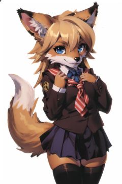 absurdres, highres, ultra detailed, masterpiece, sharp shading,portrait, standing,white background, fox furry girl,kid,school uniform,outdoors,blonde,fur paws,black thighhighs,chibi(high detail fur,fur skin:1.3), <lora:ChristaAOT:0.5>