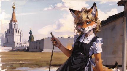 absurdres, highres, ultra detailed, masterpiece, sharp shading,traditional media, fox furry girl,kid,black dress,(white apron:1.2),sovietform,communism, windblonde,high detail fur,outdoors,sunlight, paws,moscow,sovietlooking at viewer,  <lora:sovietForm:0.5> <lora:add_detail:0.6>