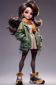 masterpiece, best quality, 8k, official art, cinematic light, ultra high res, 1girl, solo, brown hair, earrings, jewelry, brown eyes, long hair, scarf, dress, shoes, flower, sneakers, jacket, standing, full body, pantyhose, smile