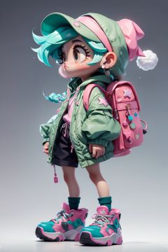 masterpiece, best quality, 8k, official art, cinematic light, ultra high res, 1girl, child, solo, shoes, pink headwear, hat, jacket, star \, (symbol\), bag, backpack, standing, full body, sneakers, socks, closed mouth, shorts, long sleeves, jewelry, braid, earrings, long hair, pink footwear, hood, drawstring, open jacket, hood down, gradient, open clothes, bright pupils, gradient background, grey background, green hair
