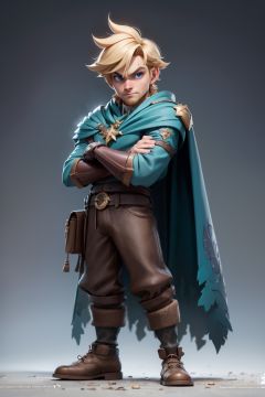 masterpiece, best quality, 8k, official art, cinematic light, ultra high res, 1boy, solo, crossed arms, blonde hair, blue eyes, cape, boots, watermark, standing, full body, short hair, brown footwear