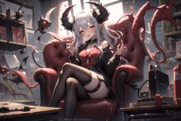 masterpiece, best quality,1girl, demon girl, hell, (red theme:1),collared shirt, desk, sitting, office<lora:GPTS6 Hella-sthetic_424353:0.75> <lora:S12 v4.2 NAI_208163:0.75>