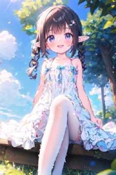 extremely detailed 8K wallpaper,masterpiece, best quality, 1girl, child,white dress,no shoes,flat chest,from below, child,smile,long hair,sitting,pointy ears,elf,twintails,bare legs,loli, lace, bare legs, thigh strap, indoors,hidden hands, lolita_fashion,white pantyhose, dress,cuteloli,girl,Dress,fairy tale girl,cozy anime