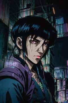 neon city, closeup portrait of a woman with Fishtail braid haircut, buildings, signs, cyber tokio, cyberpunk, (night:1.3), dark <lora:NEOTOKIO_V0.01:0.9>