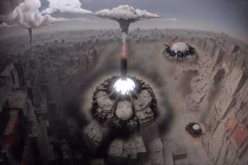 helicopter view, atomic mushroom explosion in the center of a futuristic Cairo, smoke, destruction, fire, cyberpunk, tech, fisheye lens <lora:NEOTOKIO_V0.01:0.9>