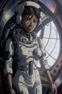 closeup of a girl Nigerian steampunk astronaut in a prismatic chamber, steam powered implants <lora:NEOTOKIO_V0.01:0.9>