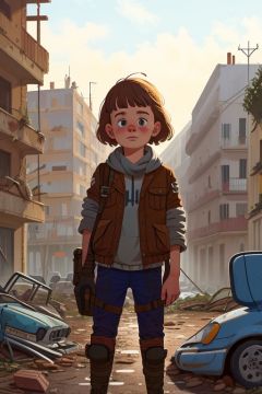 a Swedish woman in a destroyed city  in Spain, post apocalyptic, kid, <lora:COOLKIDS_V2:1>