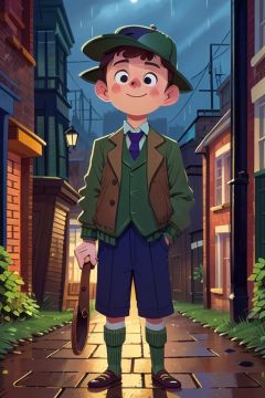 kid sherlock holmes standing in a london alley at night, hat, looking up, heavy rain, puddles  <lora:COOLKIDS_V2:1>