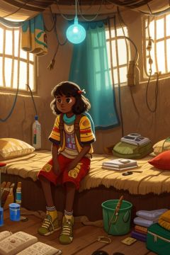a Peruvian woman in a futuristic room  in Senegal, post apocalyptic, kid, <lora:COOLKIDS_V2:1>