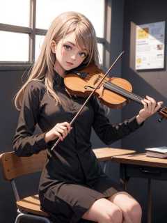 1girl, playing violin, violin, bow \(music\), sitting in the classroom high school uniform,   golden hair, indoor, full body, big breasts,best quality, 8k, masterpiece, <lora:violin_v11-000008:0.56>