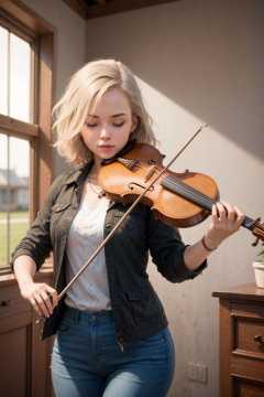 1girl, playing violin, violin, bow \(music\), indoor, ((jacket)), closed eyes, Bob Cut,   golden hair,best quality, 8k, masterpiece,<lora:violin_v11-000008:0.53>