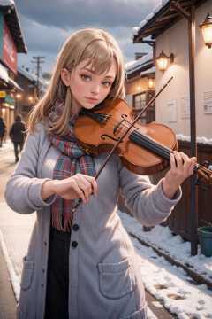 1girl, playing violin, violin, bow \(music\), snow, stand on street, coat, winter, scarf, snowing,   golden hair, indoor,best quality, 8k, masterpiece,<lora:violin_v11-000008:0.6>