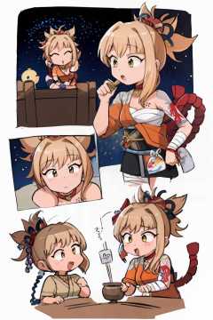 masterpiece, best quality, <lora:yoimiya:1>, <lora:style05:1>,yoimiya \(genshin impact\), blonde hair,ponytail, hair ornament,yellow eyes,choker,bandages,cleavage,chest tattoo,arm tattoo,bandaged arm,rope,shimenawa,kimono, japanese clothes, hadanugi dousa,single glove, obi,sash,vision (genshin impact),pouch,kinchaku,bandaged leg, multiple girls, multiple views, comic,border, koma,white background, (chibi:1.2),fireworks,