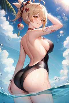 masterpiece, best quality, <lora:yoimiya:1>,1girl, swimsuit, breasts, ass, solo, yoimiya (genshin impact), one-piece swimsuit, blonde hair, smile, large breasts, looking at viewer, white one-piece swimsuit, sky, tattoo, looking back, thighs, day, grin, blush, outdoors, ponytail, blue sky, bangs, sideboob, water, arm tattoo, hair ornament, cloud, bare shoulders, choker, rainbow, from behind, back, red choker, partially underwater shot, cowboy shot, bare arms, wet, wading, sidelocks, parted lips, orange eyes, sunlight, hair between eyes, yellow eyes, highleg, adjusting swimsuit, standing, long hair, ahoge, adjusting clothes, highleg swimsuit, ocean, ribbon, water drop, bubble, chest tattoo, teeth, bare back, shoulder tattoo