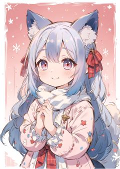 (azhiichigo style, big eyes, thick lines, cute),((Style):kawaii style),flat color,soft lighting,(depth of field:1.25),(solo:1.4),(1girl),[upper body],detailed beautiful wine_red eyes,multicolored,(long_hair),((gratient hair), (soft and fluffy fox_ears:1.2),smile,(white:1.25)+silvery hair//),ribbon,(Clothes with lots of frills, lace and ribbons:1.35),long sleeves,(1 soft and fluffy fox_tail),(pastel color style:1.1),white and pink clothes,(light plaid scarf),fantastic colorful,(snow:1.2),outside border,(plaid background:1.3),(masterpiece:1.25),best quality,