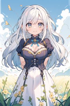 (masterpiece, best quality, high quality, highres, ultra-detailed),(arms behind back:1.2),(detailed beautiful eyes:1.3),swept bangs,silver hair,white skirt,yellow eyes,big breasts,field,sun,cloud,smile,blush,fantasy clothes,gothic,cleavage,(looking at viewer:1.2),bow,
