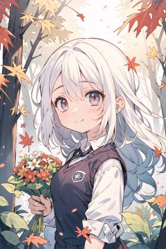 smile,(portrait),botox,(from_side),(looking_away),(turning_head),upper_body,1girl,solo,loli,petite,white_hair,(very_long_hair),red_eyes,medium_breasts,(closed_mouth),(emotionless),straight_hair,white_shirt,(sweater_vest),(black_pleated_skirt),(white_pantyhose),wind_lift,hair_lift,maple_leaves,maple_tree,falling_leaves,(autumn),branches,bushes,foreground_plants,forest,sunshine,tyndall_effect,praying,(holding_bouquet),((masterpiece)),(highres),(best_quality),(highly_detailed),(original),(Delicate background),(extremely detailed 8K wallpaper),cinematic lighting,volume lighting,light particles,shaded_face,beautiful_detailed_eyes,depth_of_field,perspective,