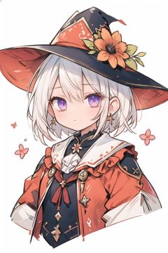 quality_best,style_onineko,(Distinct pupils)(Clear eyes),wizard hat,1girl,solo,c,earrings,looking at viewer,flower,short hair,bangs,closed mouth,simple background,black headwear,white background,red flower,upper body,white hair,hair intakes,frills,purple eyes,hair ornament,expressionless,hat flower,eyelashes,best quality,<lyco:[LoHa]style_onineko_v2:0.6>,<lora:bdsqlsz:0.6>,