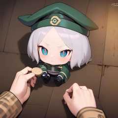 masterpiece, best quality, godoacrime, from above, chibi, pov, holding coin, (otto:1.4), 1boy, green hat <lora:GoDoACrime meme:1> <lora:Rezero World_204380:1>
