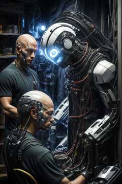 ((masterpiece)), ((best quality)), 8k, high detailed, ultra-detailed,xs-wasteland-style,  realistic, multiple boys, science fiction, robot, chinese architecture, cable, bald, cyberpunk, hat,  <lora:waste:0.7>