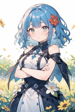 masterpiece, best quality, cute,medium hair, blue hair, [blue | yellow] eyes, wavy hair, blunt bangs, large breasts, dress, bare shoulders, flower, crossed arms,depth of field, field,