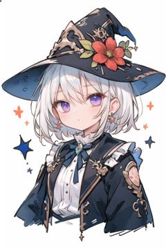 quality_best,style_onineko,(Distinct pupils)(Clear eyes),wizard hat,1girl,solo,c,earrings,looking at viewer,flower,short hair,bangs,closed mouth,simple background,black headwear,white background,red flower,upper body,white hair,hair intakes,frills,purple eyes,hair ornament,expressionless,hat flower,eyelashes,best quality,<lyco:[LoHa]style_onineko_v2:0.6>,<lora:bdsqlsz:0.6>,
