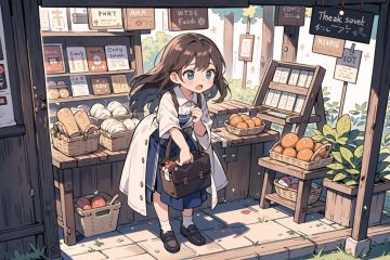 masterpiece,best quality,from_above,dutch_angle,full_body,facing to the side,1girl,market_stall,wicker_basket,shouting,leaning_forward,hands on counter,